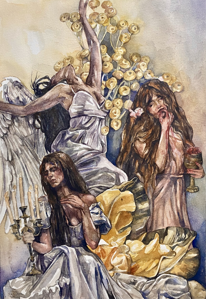 Sienna Considine, Burn her wings (Inspired by Voilà – Barbara Pravi), 2025, watercolour and coloured pencil on paper. Courtesy of the artist.