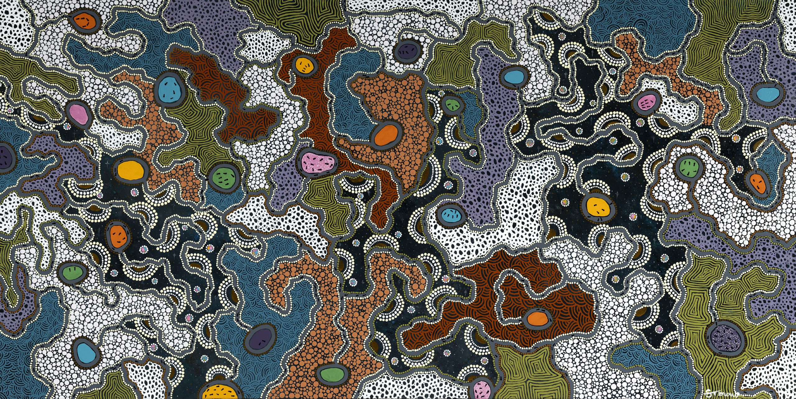 Three echoes – Western Desert art is a stunning exhibition exploring the poetic notion of echoes – how metaphorically and metaphonically we can echo a thought, a sentiment or a consciousness. In the 1970s, Australian Aboriginal people from the desert began talking to the world through art, transferring their creation stories of the land and people to canvas. Now in the 2020s, this foundational echo is going back and forth. No longer a one-sided, outward calling, it reverberates multi-dimensionally within wider Australian and global communities.