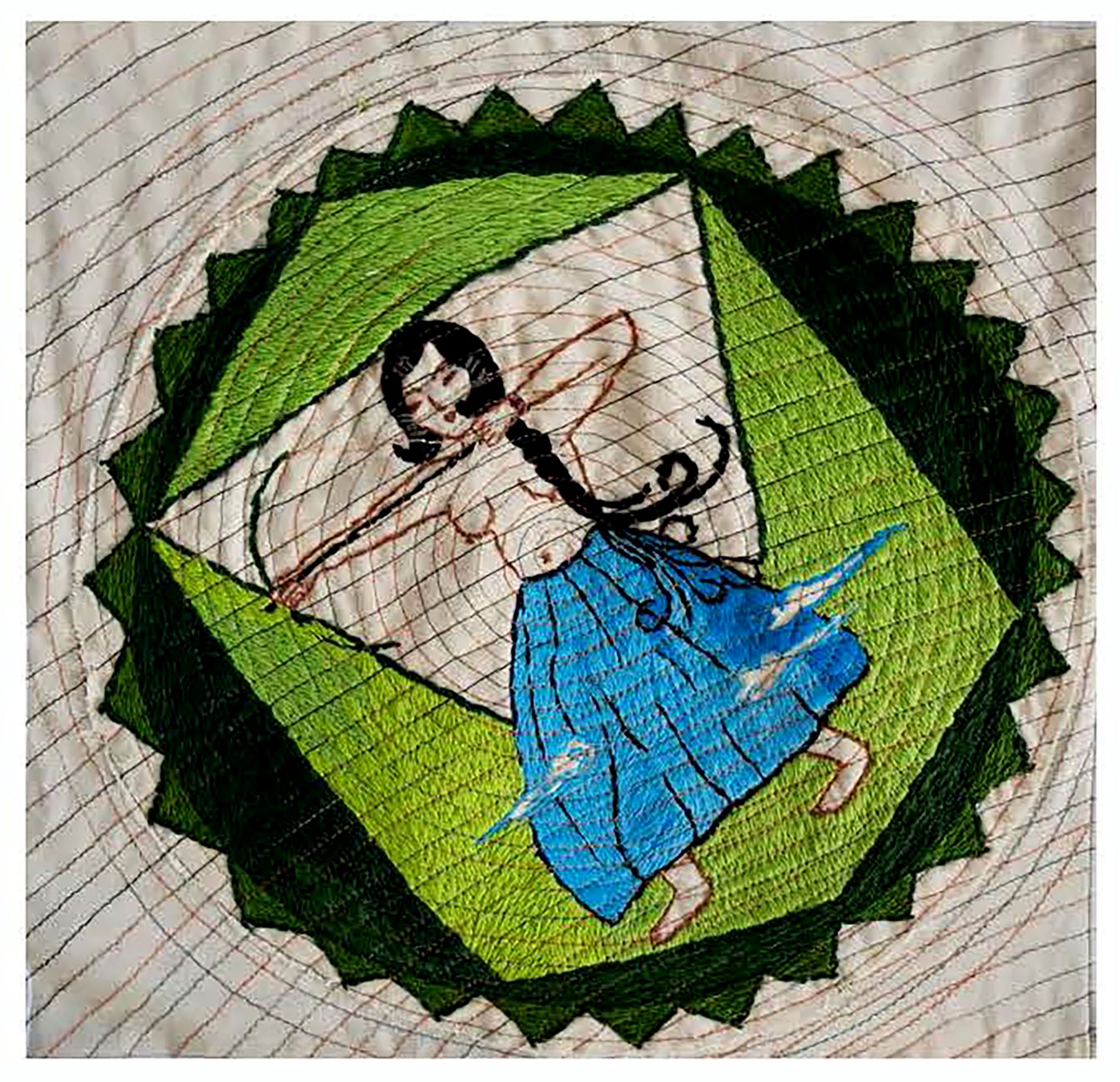 Razia Ghazal, Zamin,2025. Ink, cotton, silk thread, embroidery on fabric. Courtesy of the artist.