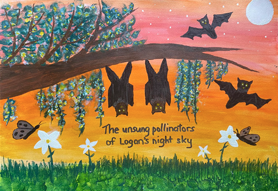 Mayor’s choice winner 2025. Alana, ‘The crucial role bats play as night time pollinators in Logan’s diverse ecosystems. These silent guardians travel from plant to plant carrying pollen and supporting the reproduction of various plants species.’